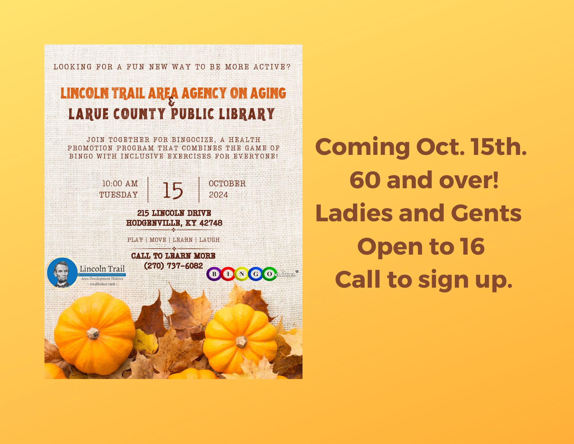 To those aged 60+, join us on Tuesday October 15th at 10:00am for a health promotion program combining Bingo! with inclusive exercises for all!