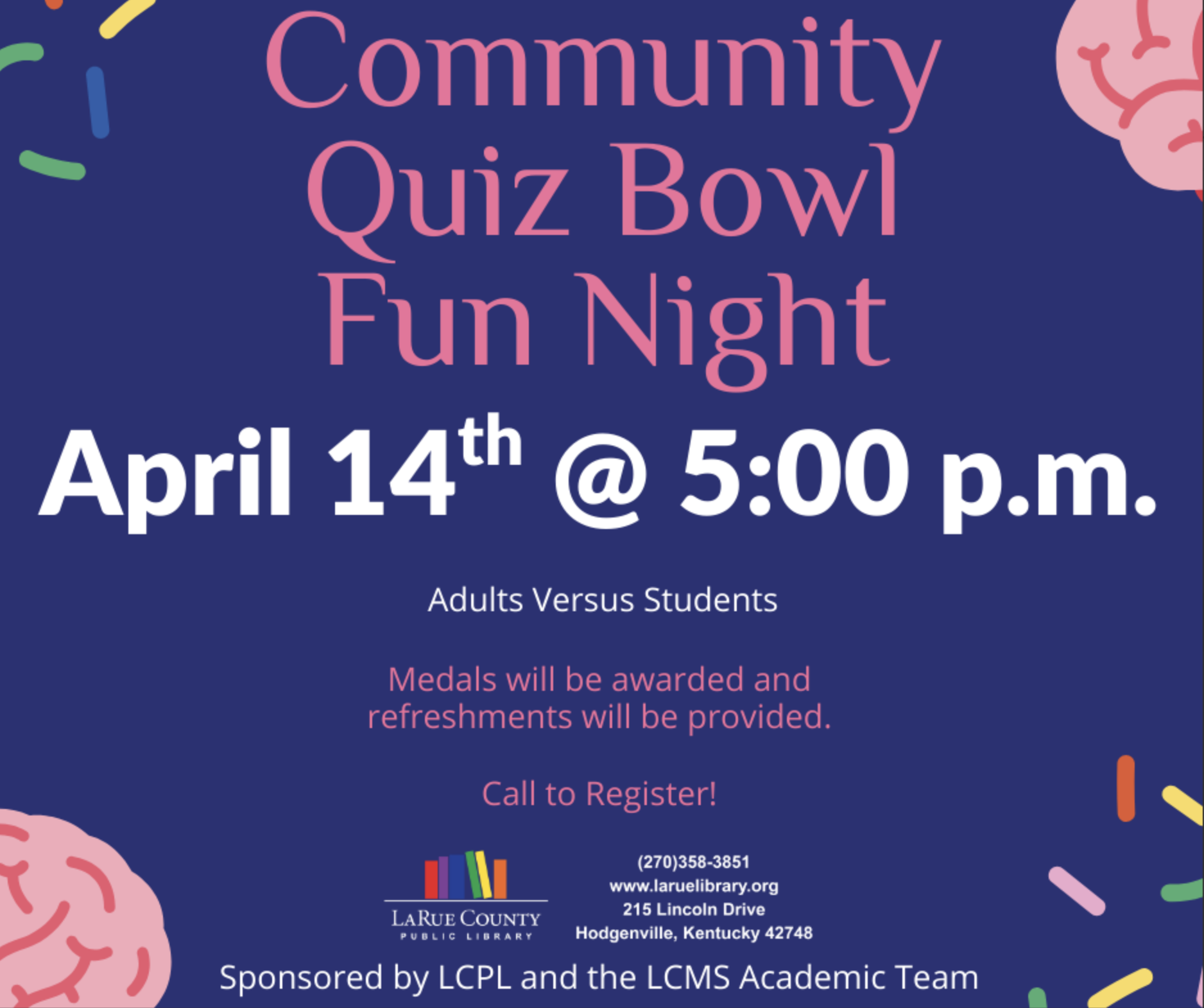 Put your knowledge to the test at our Community Quiz Bowl Fun Night on Tuesday, April 14th at 5 PM, featuring a friendly showdown between adults and students. Medals will be awarded, refreshments provided, and registration is required—call to sign up for this event sponsored by LCPL and the LCMS Academic Team.