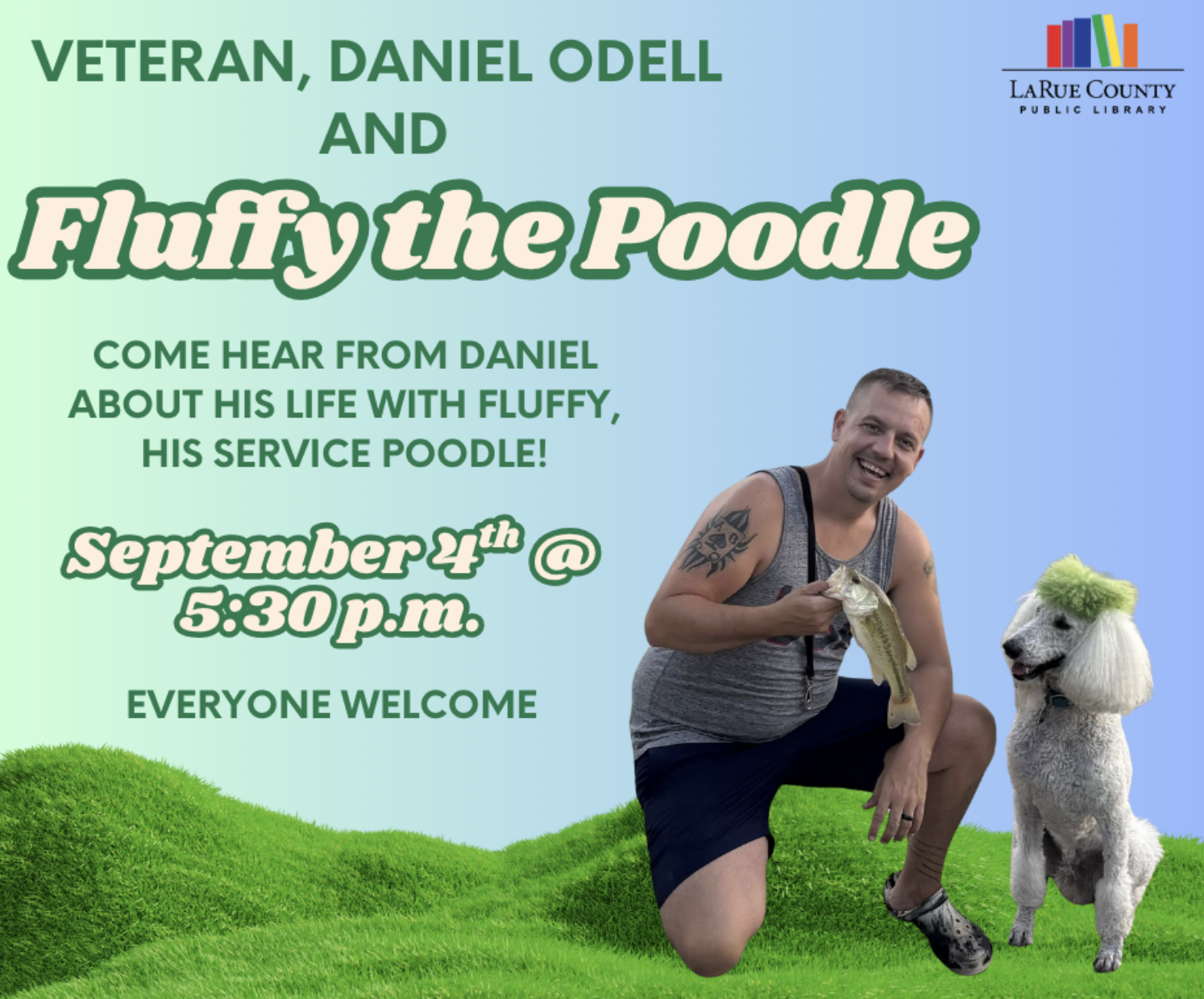 Meet Fluffy the Poodle, service poodle for veteran Daniel Odell. Come hear from Daniel about his life with Fluffy. Join us on Thursday, September 4th at 5:30 PM.