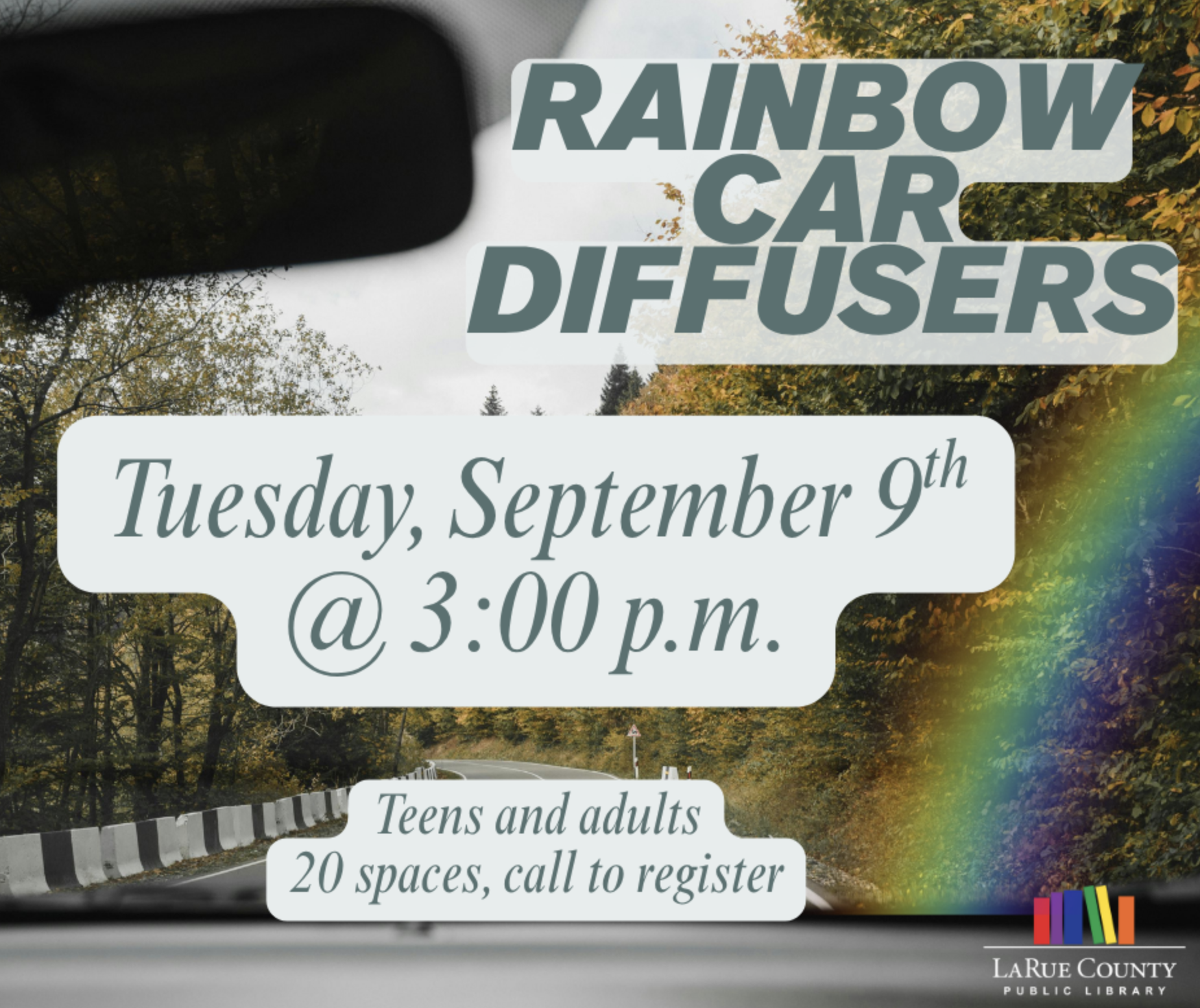 Join us at the library on Tuesday, September 9th at 3:00 PM to craft your own colorful Rainbow Car Diffuser! This free program is open to teens and adults—call the library to register and reserve your spot.