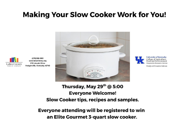 Join us on Thursday, May 29th at 5:00pm for a slow cooker tips and recipes class!