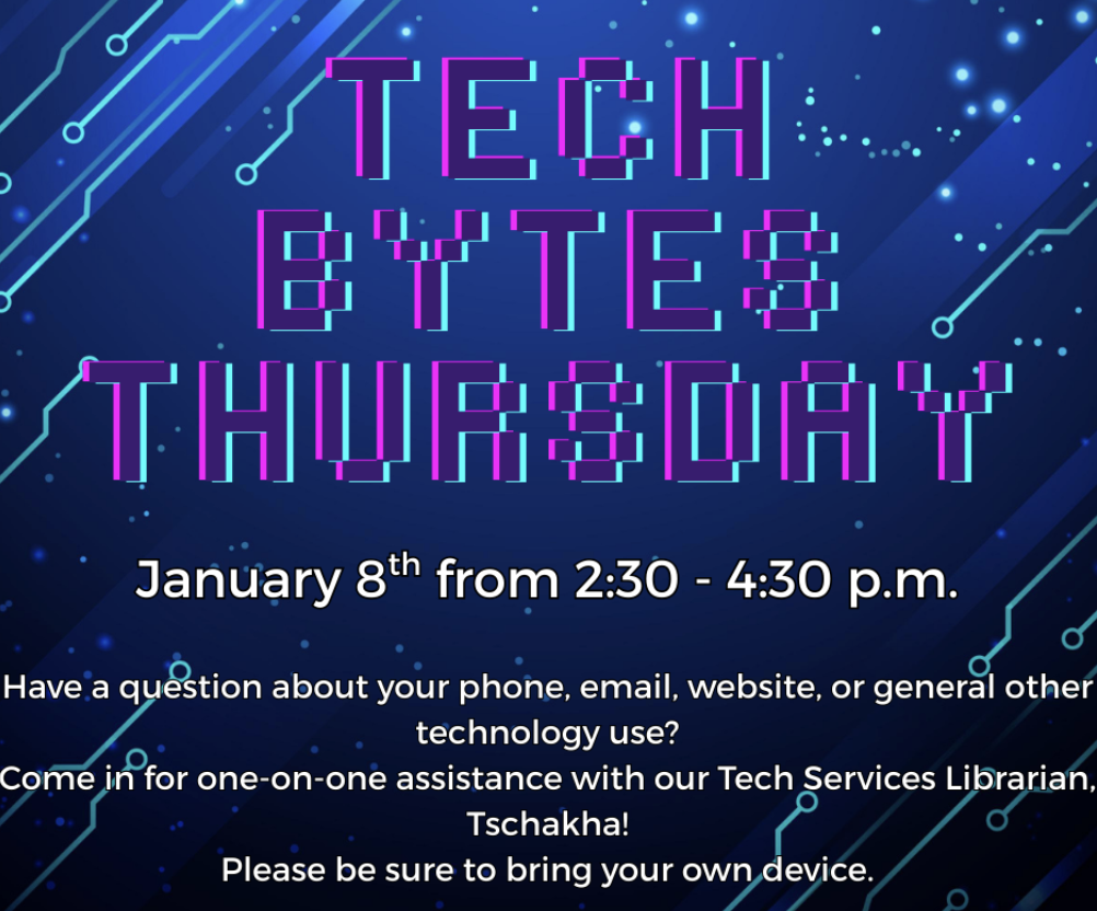 Do you have a question about your phone, email, website, or any other technology use? Come in for one-on-one assistance with our Tech Services Librarian, Tschakha! Please bring your own device. Assistance is available on Thursday, January 8th from 2:30 until 4:30.