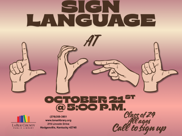 Join us on Tuesday, October 21st @ 5:00pm to learn American Sign Language. Teens & Adults. Call to register. Class limit of 24.