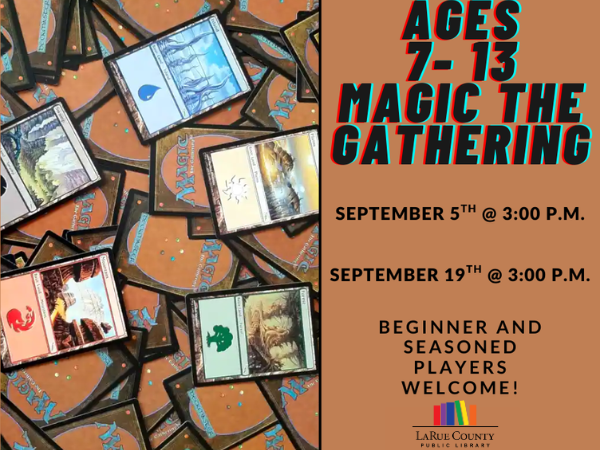 Join us at the library on Friday, September 5th and Friday, September 19th @ 3:00pm for Magic: The Gathering, a fun and welcoming event for kids ages 7–13. Whether you’re new to the game or a seasoned player, come learn, play, and connect with others who enjoy Magic!