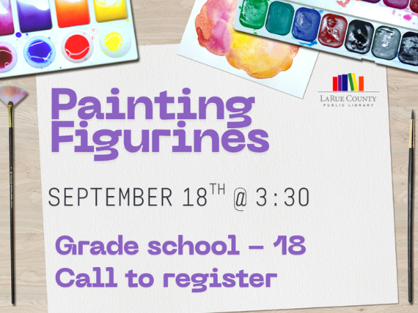 Bring out your inner artist and join us on Thursday, September 18th @ 3:30pm to paint figurines! Grade School - 18. Call to register.