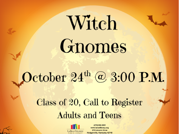 Join us on Friday, October 24th @ 3:00pm to make witch gnomes! Class limit of 20. Call to register. Adults and Teens.